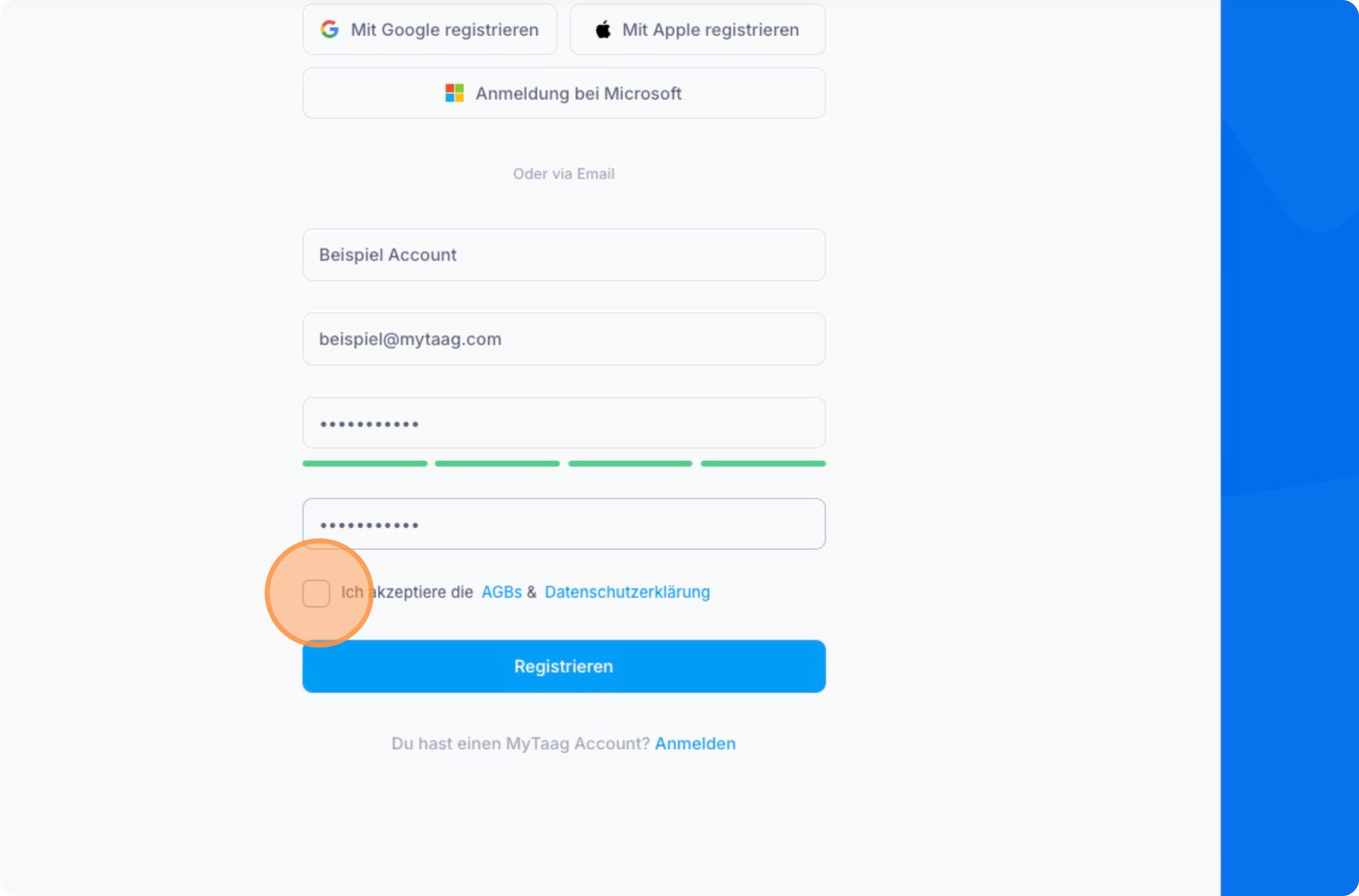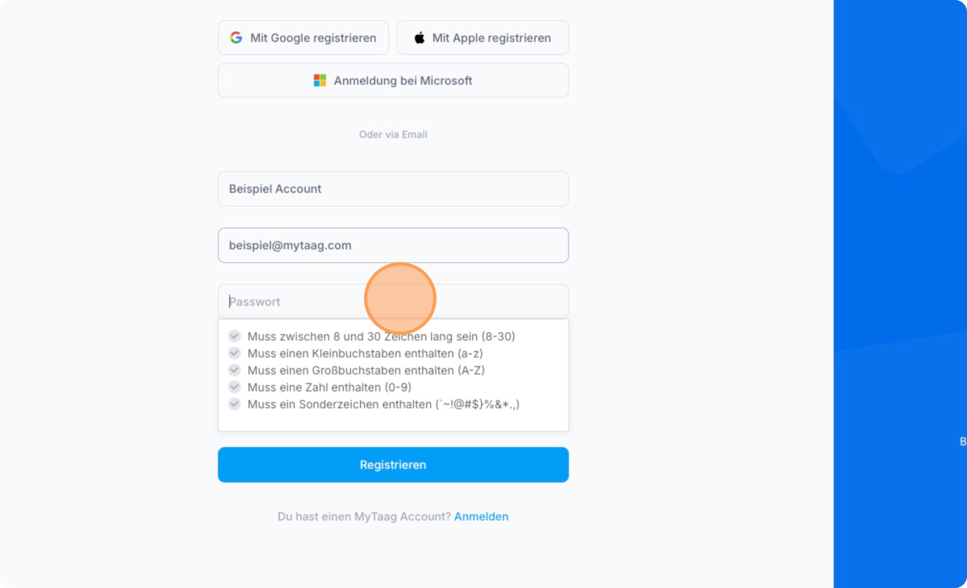 Klicke auf das Passwort Feld und gib ein sicheres Passwort ein. Die Bedingungen dafür sind darunter nochmal aufgelistet.