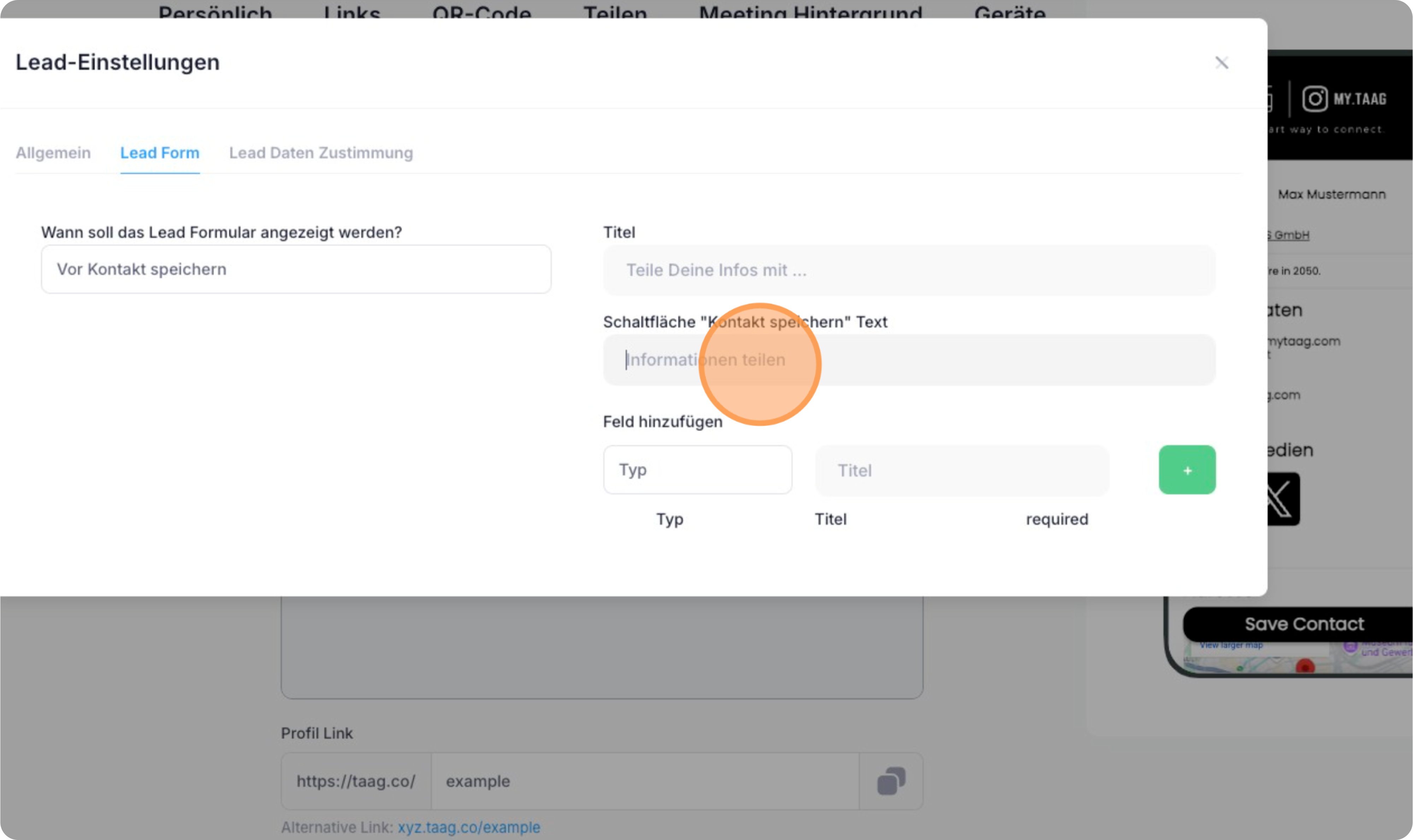 Wähle einen individuellen Text für die "Kontakt speichern" Schaltfläche beim Lead Formular.