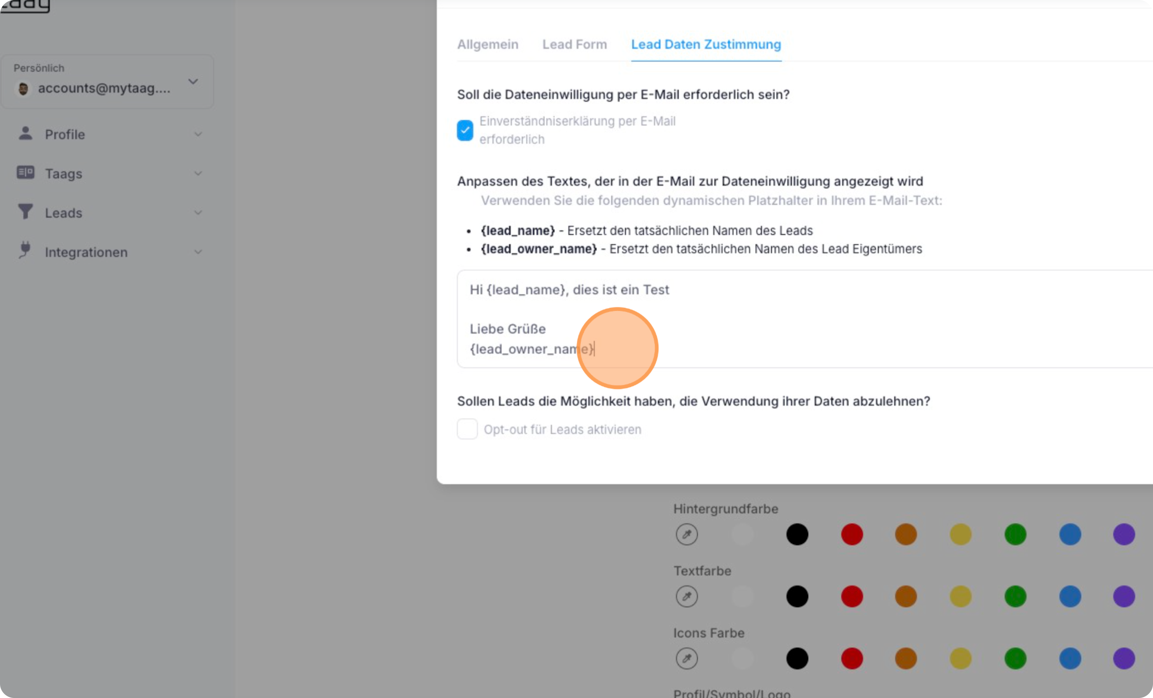 Hier kannst du Einstellungen bezüglich der Dateneinwilligung zur Leaderfassung vornehmen. Wenn du diese Checkbox aktivierst, müssen Leads explizit über eine E-Mail einwilligen, dass ihre Daten in MyTaag Web angezeigt werden.