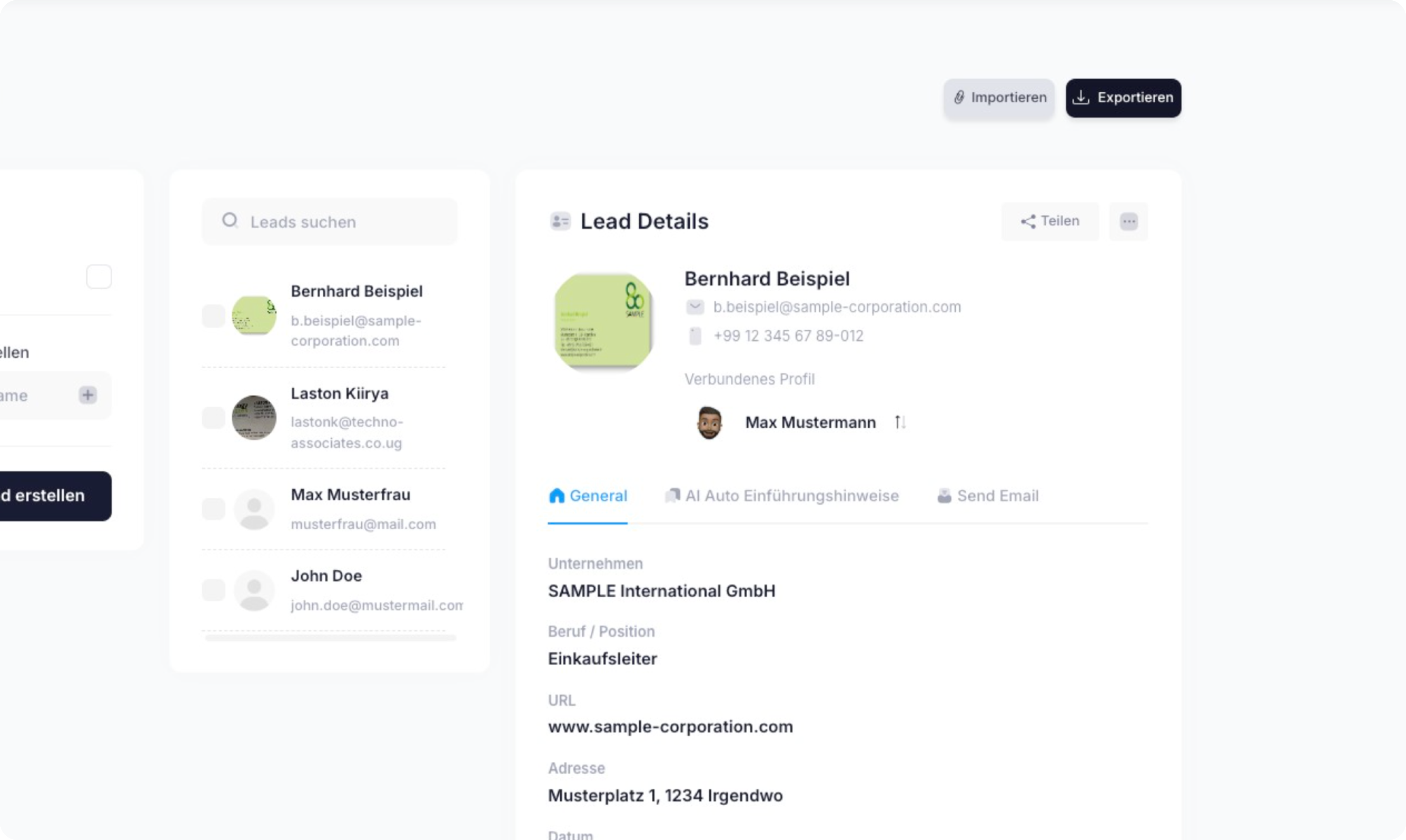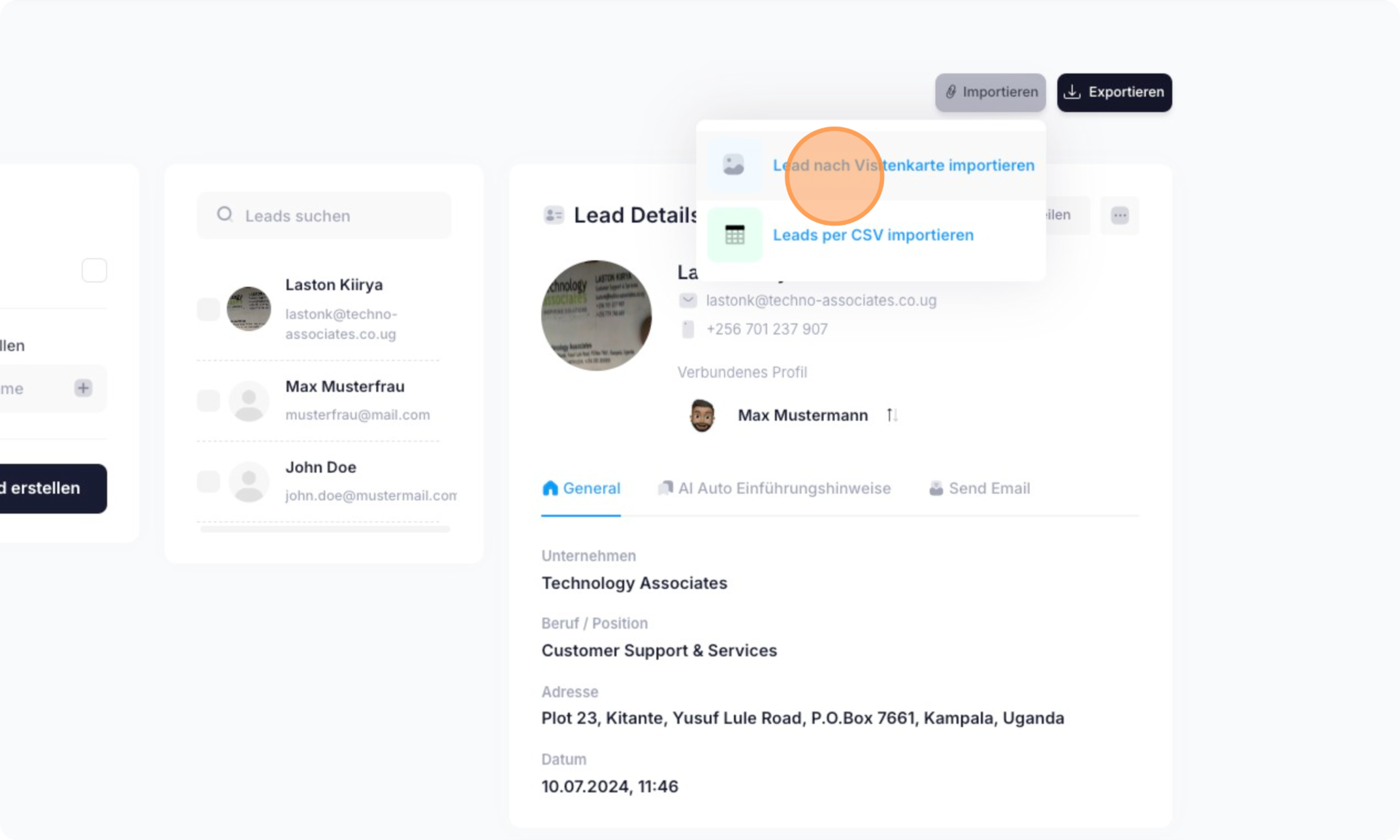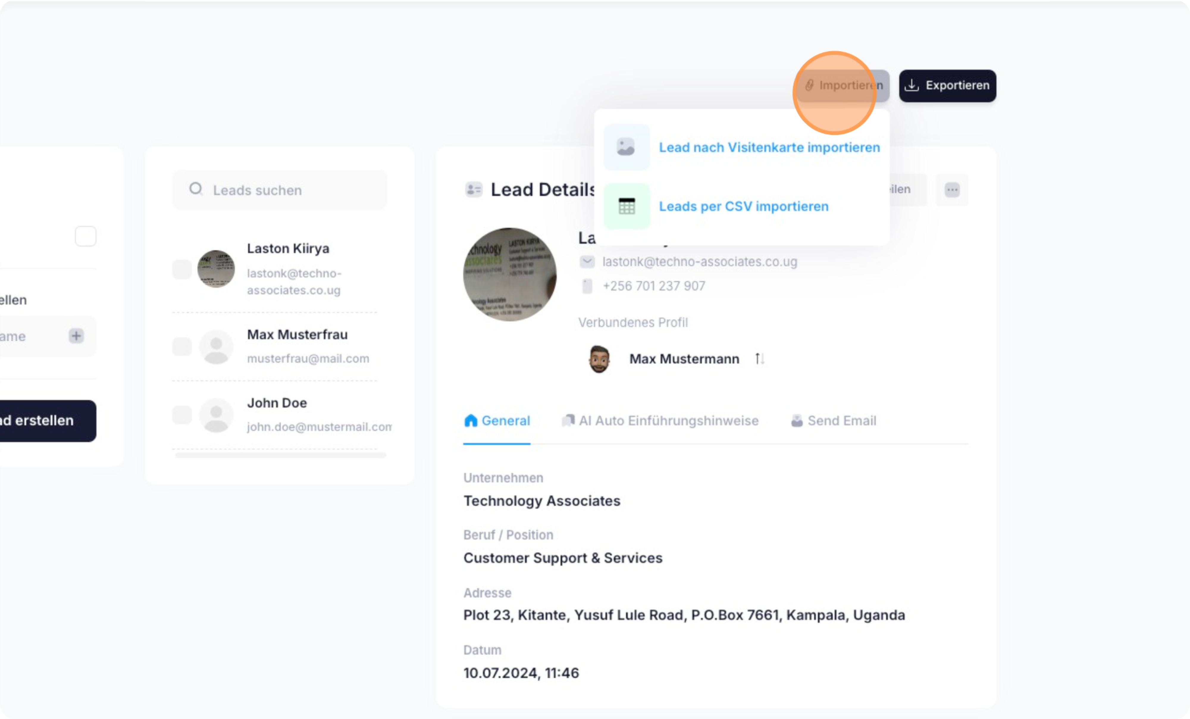 Um einen neuen Lead zu importieren, klicke oben rechts auf "Importieren".