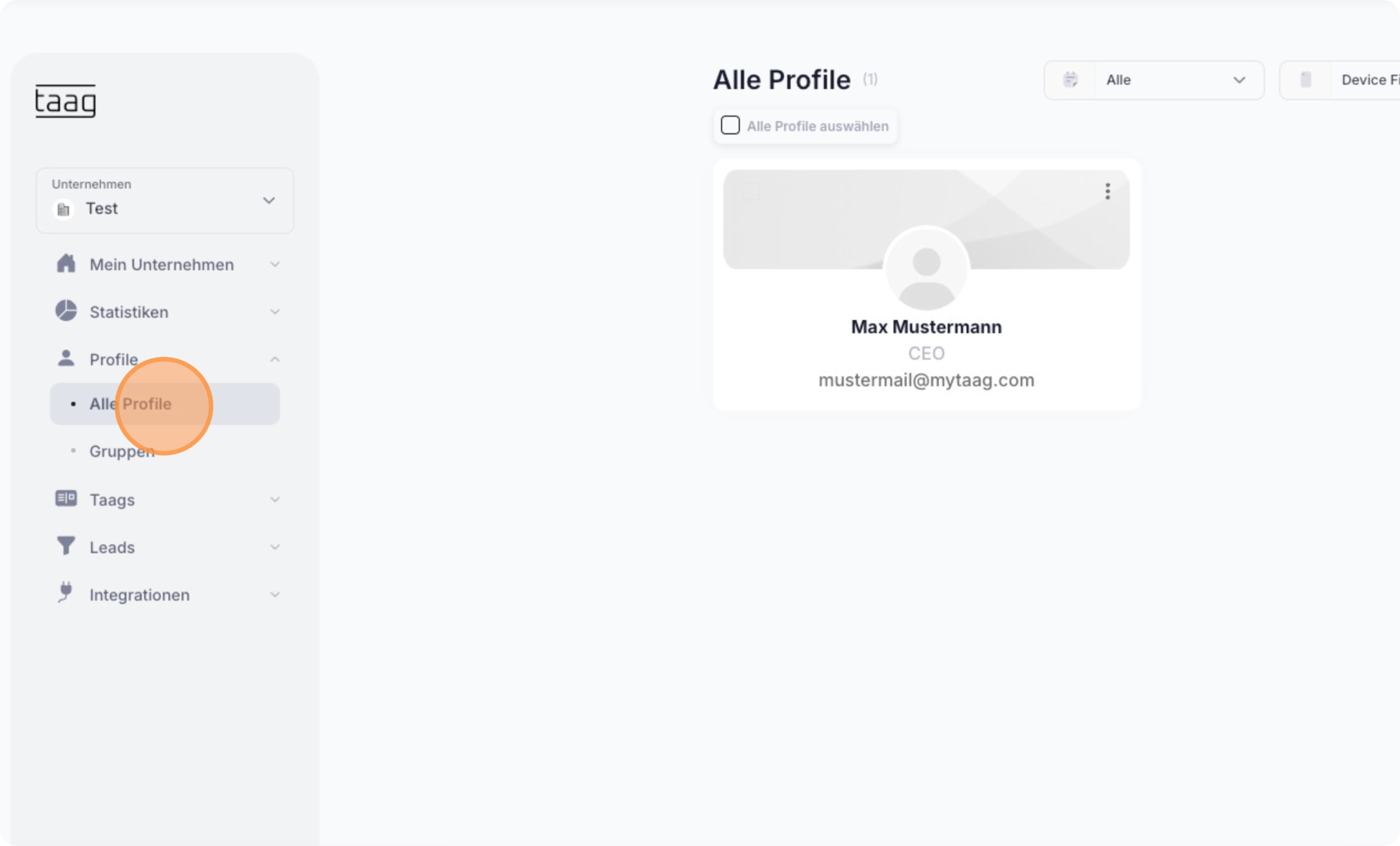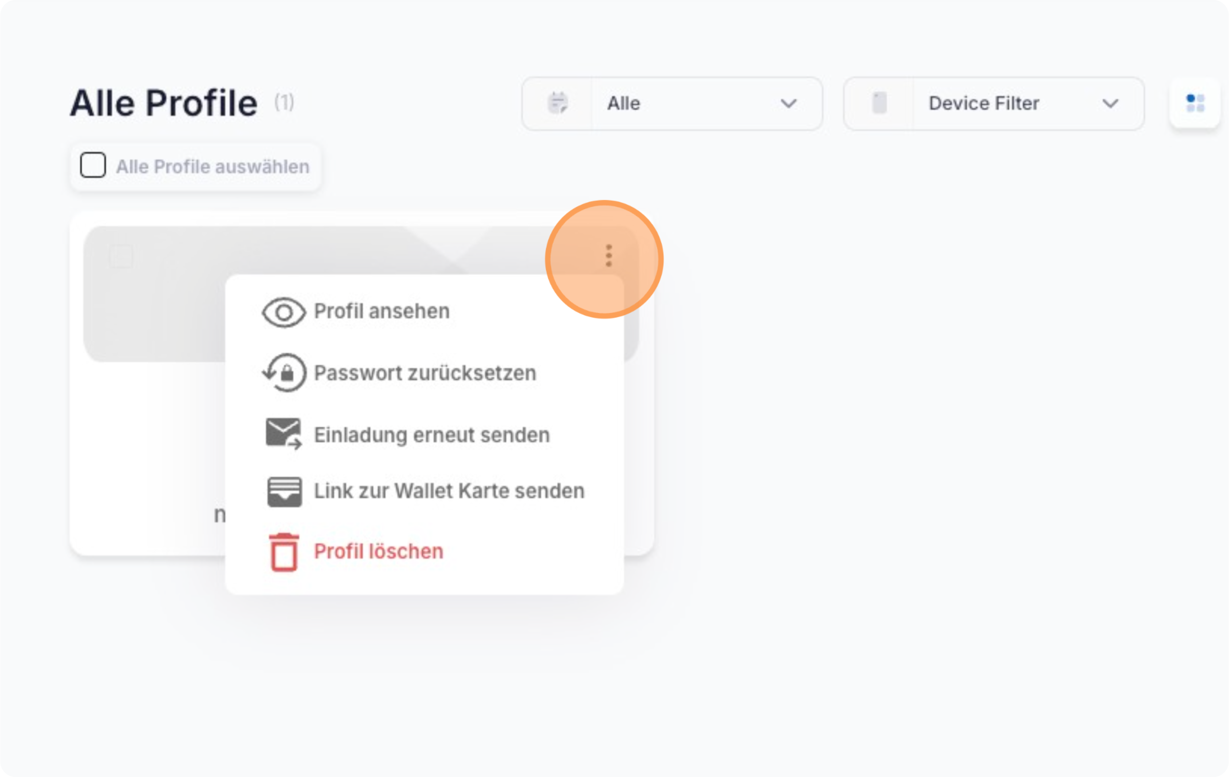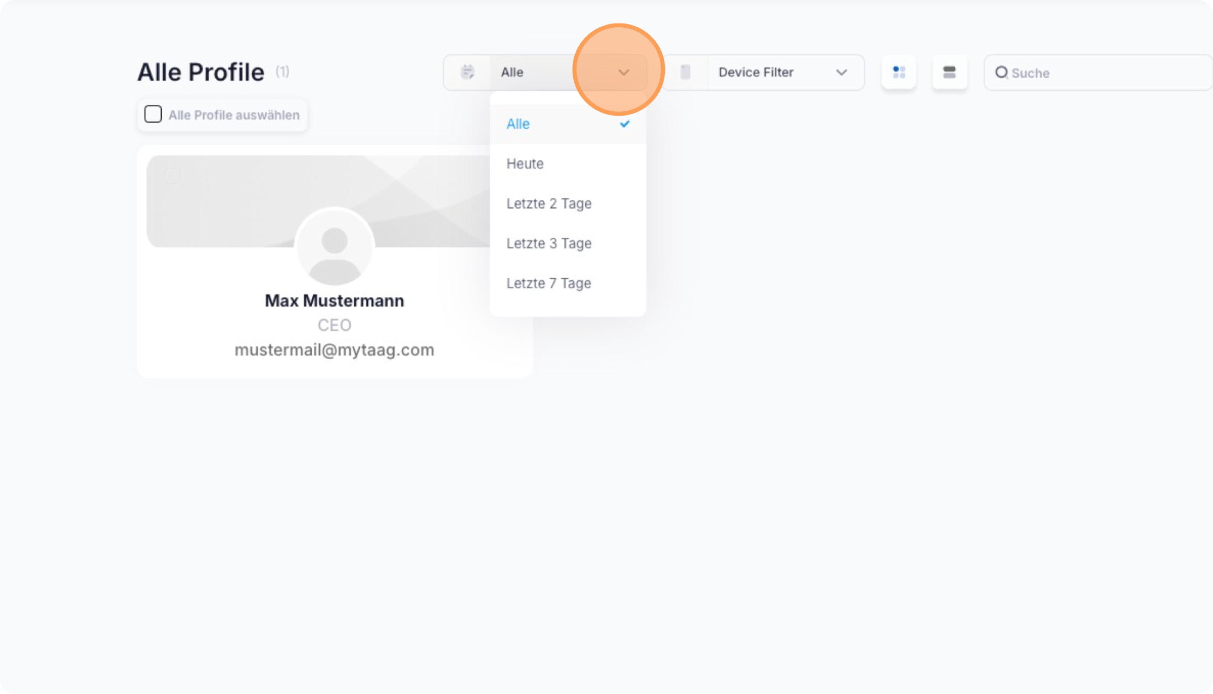 Unter "Device Filter" kannst du zwischen den Profilen filtern, welche bereits einen Taag verbunden haben und zwischen jene, die noch keinen Taag verbunden haben.