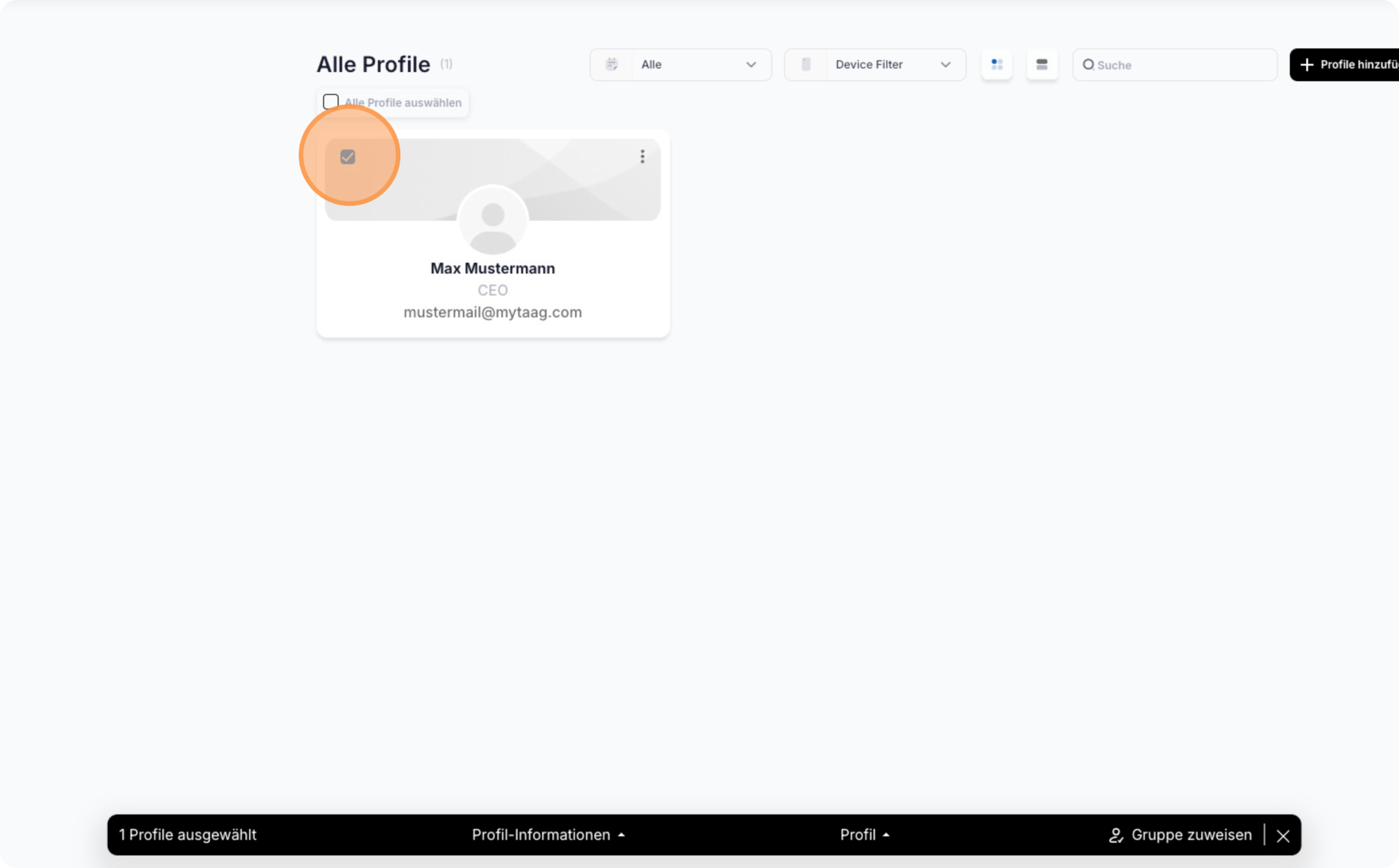 Sollten bereits mehrere Profile in dem Unternehmensprofil vorhanden sein, kannst du über die Checkboxen einzelne Profile auswählen und dementsprechend bearbeiten (Profilinformationen hinzufügen, einer Gruppe zuweisen oder weitere Einstellungen vornehmen).